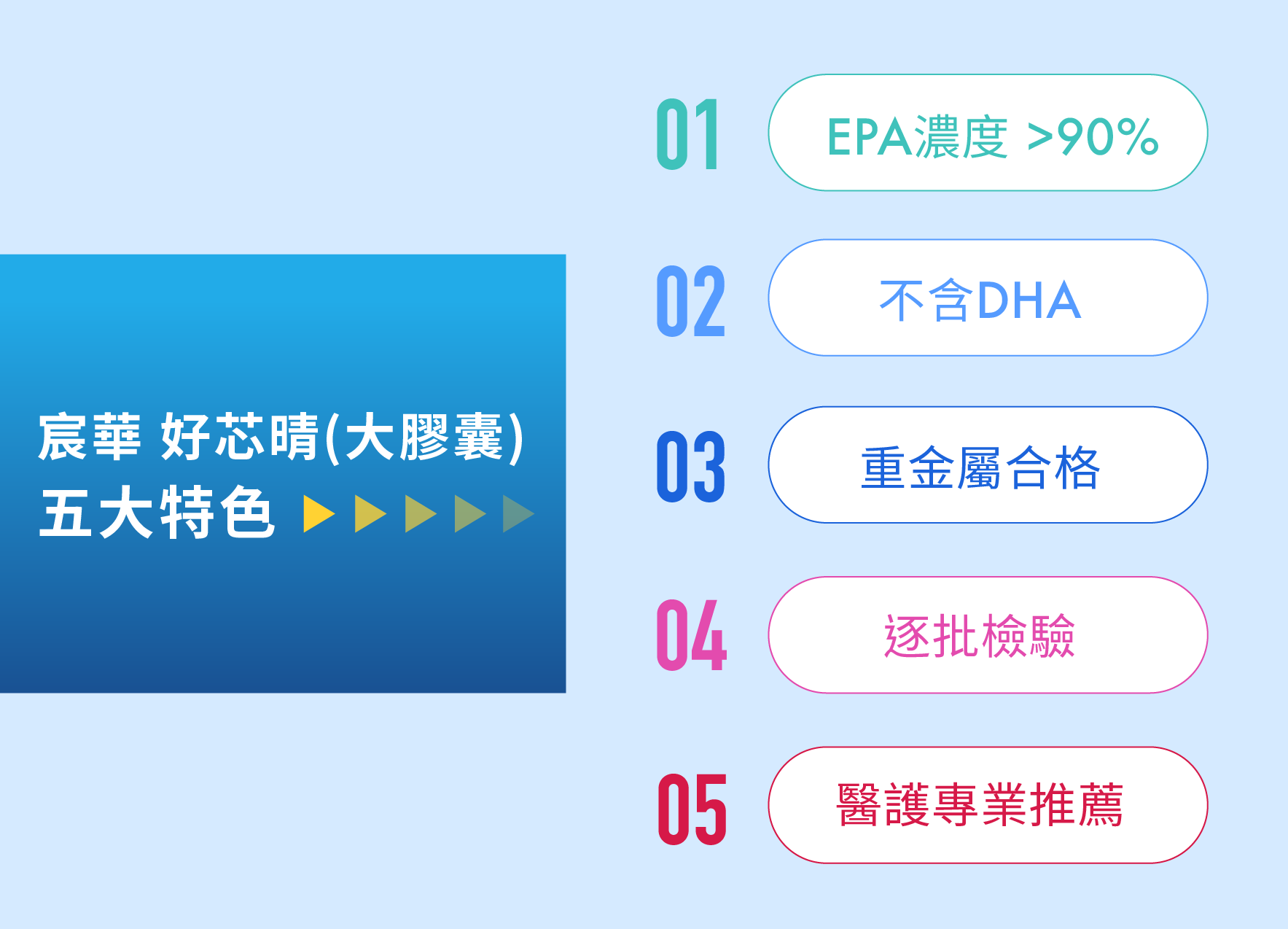 EPA/DHA 對人體的幫助各有不同,高濃度純 EPA 讓您 EPA 的攝取更容易達標,輕鬆解決您的問題、維護您的健康。宸華 好芯晴(大膠囊),採用歐盟原料,此原料為超臨界萃取純化而得,EPA 濃度更達90%且每批皆經嚴格檢驗,保證重金屬/塑化劑符合國際與台灣標準,檢驗報告透明公開(外包裝有檢驗報告連結)是您最好的選擇!
