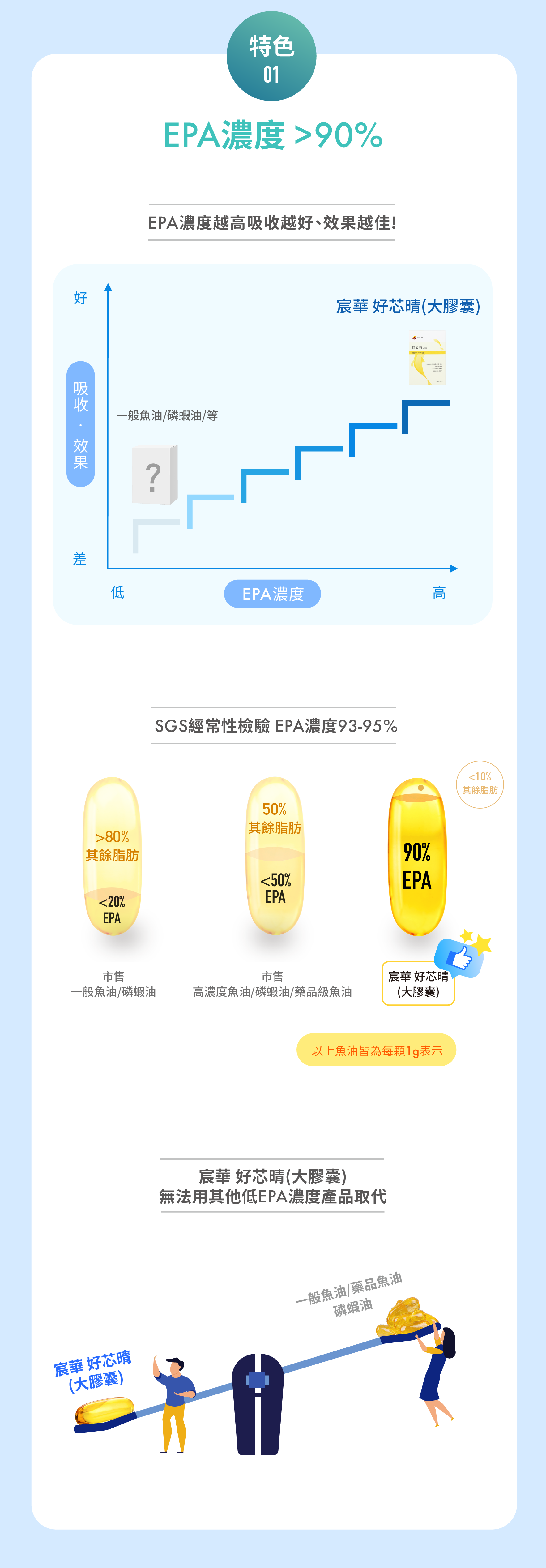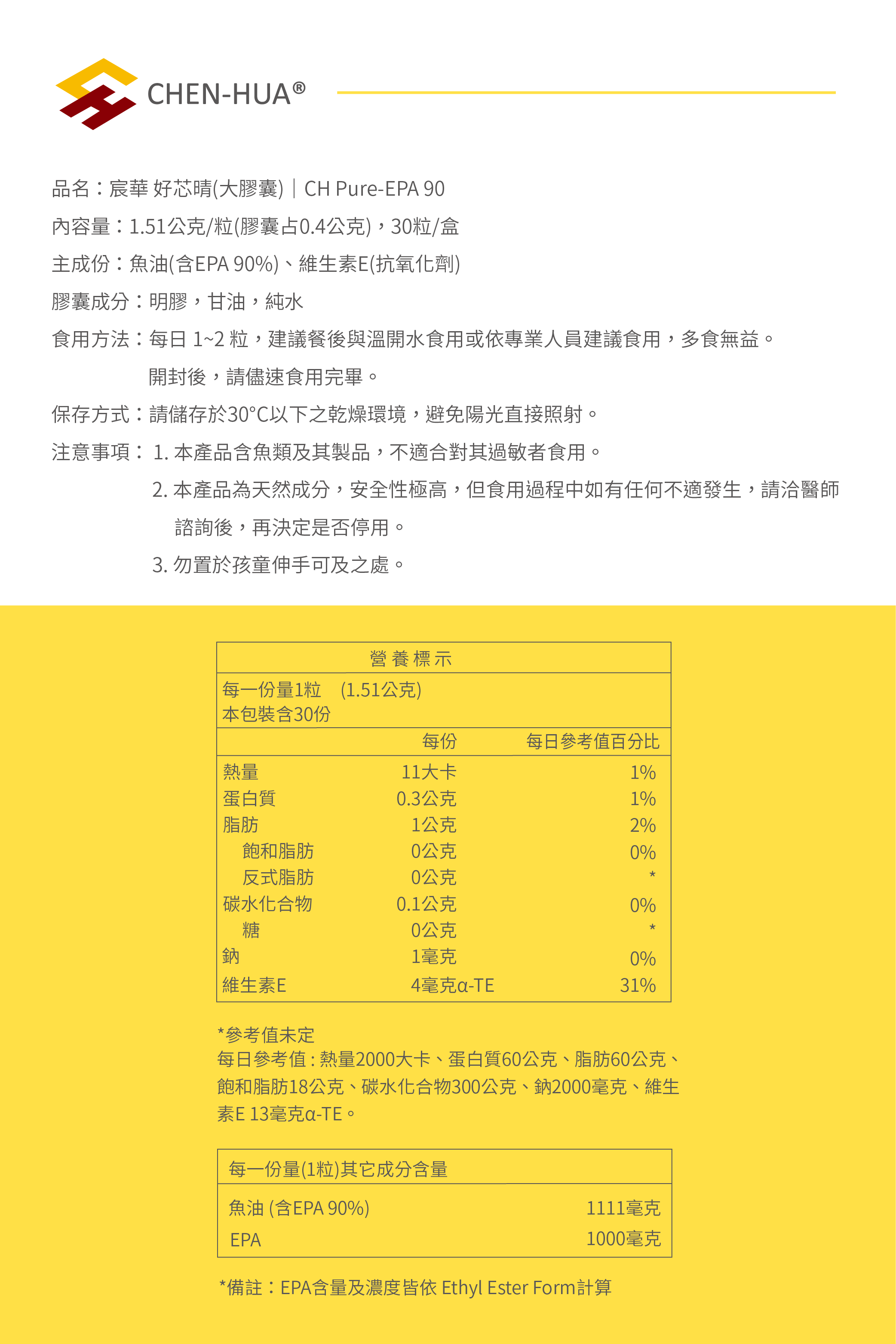 成分 : 每粒含魚油1.51公克(膠囊占0.4公克),其中EPA占1000毫克、不含DHA
