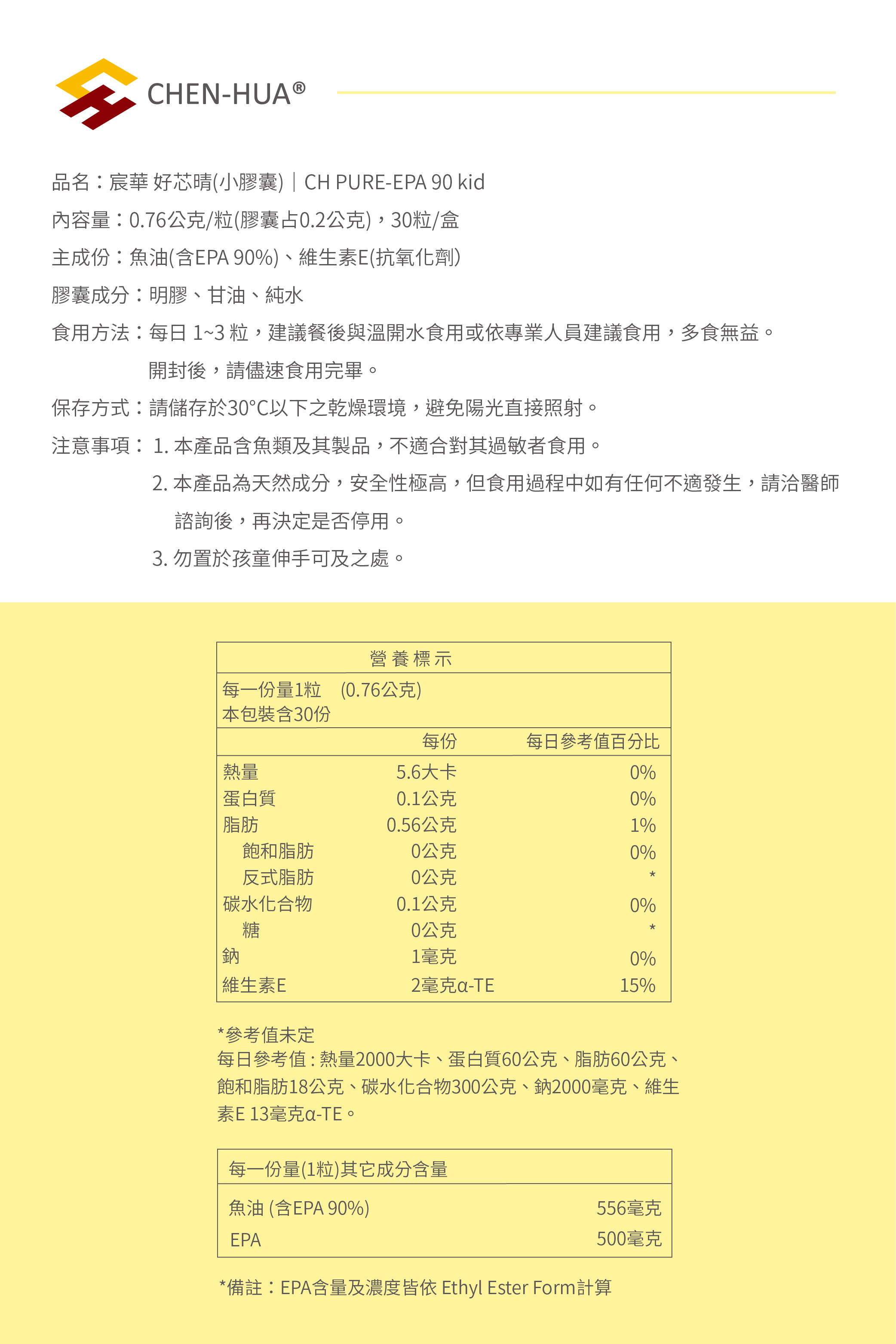 成分 : 每粒含魚油0.76公克(膠囊占0.2公克),其中EPA占500毫克、不含DHA