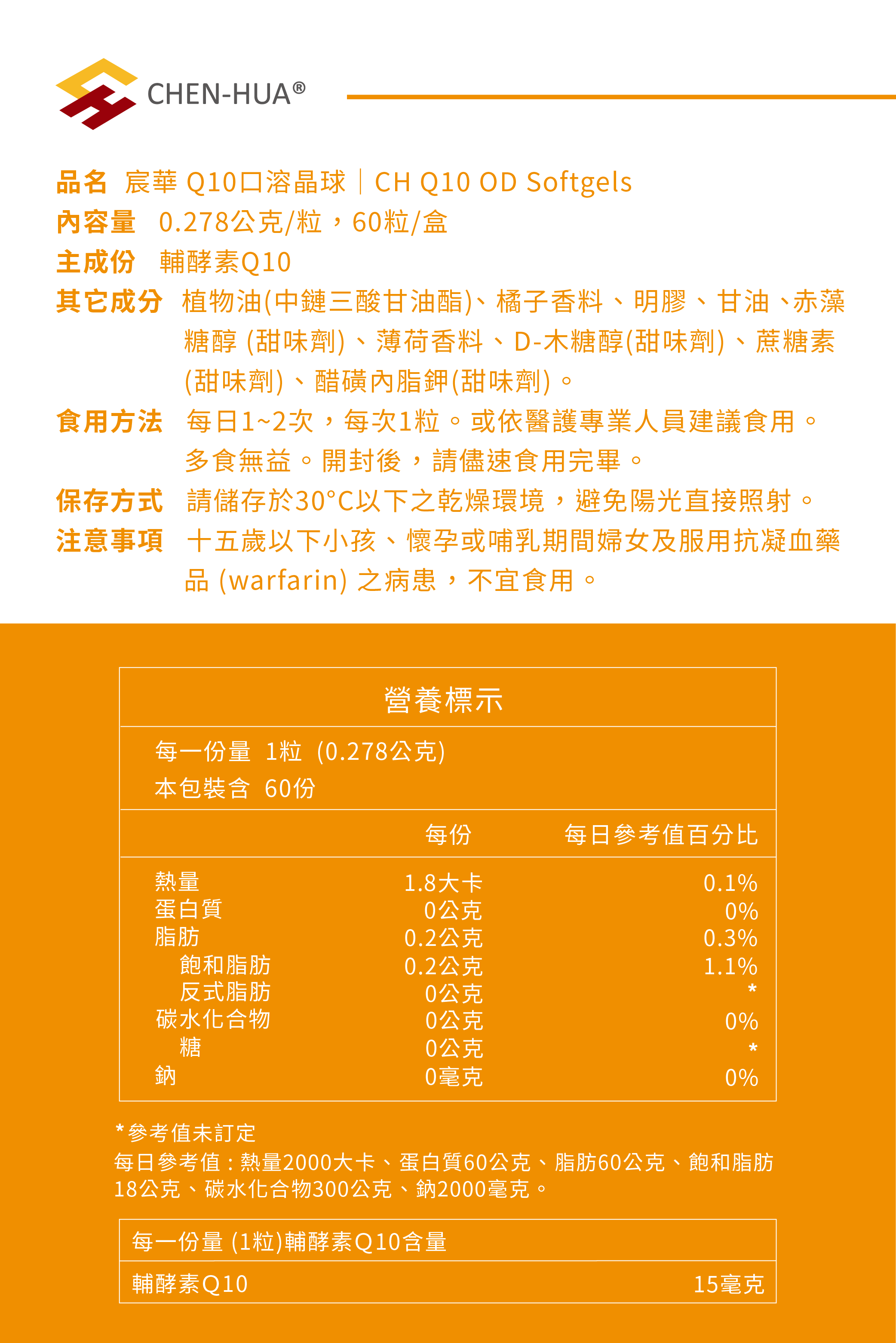 Q10雖然可以由人體自行合成及食物中取得,但隨著年齡增長,壓力加上環境荷爾蒙、飲食不均衡等因素影響讓身體製造的Q10越來越少,進而讓身體容易有疲累感。Q10口溶晶球由天然酵母發酵萃取,每日補充1~2顆可給予身體原動力、調節生理機能,維持身體健康。產品每批皆經嚴格檢驗,保證重金屬/塑化劑符合國際及台灣標準,檢驗報告公開透明(外包裝有檢驗報告連結)是您最好的選擇!