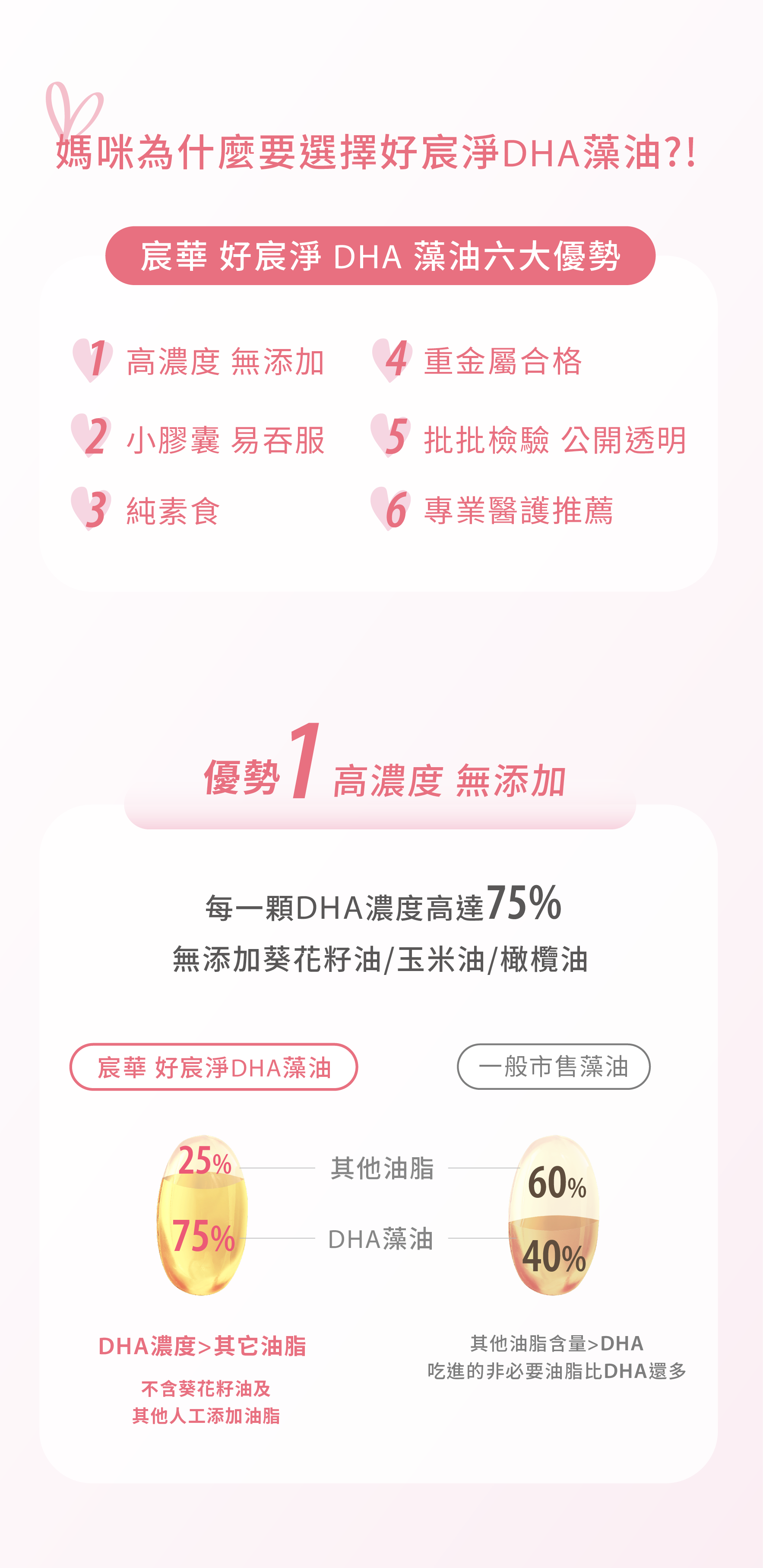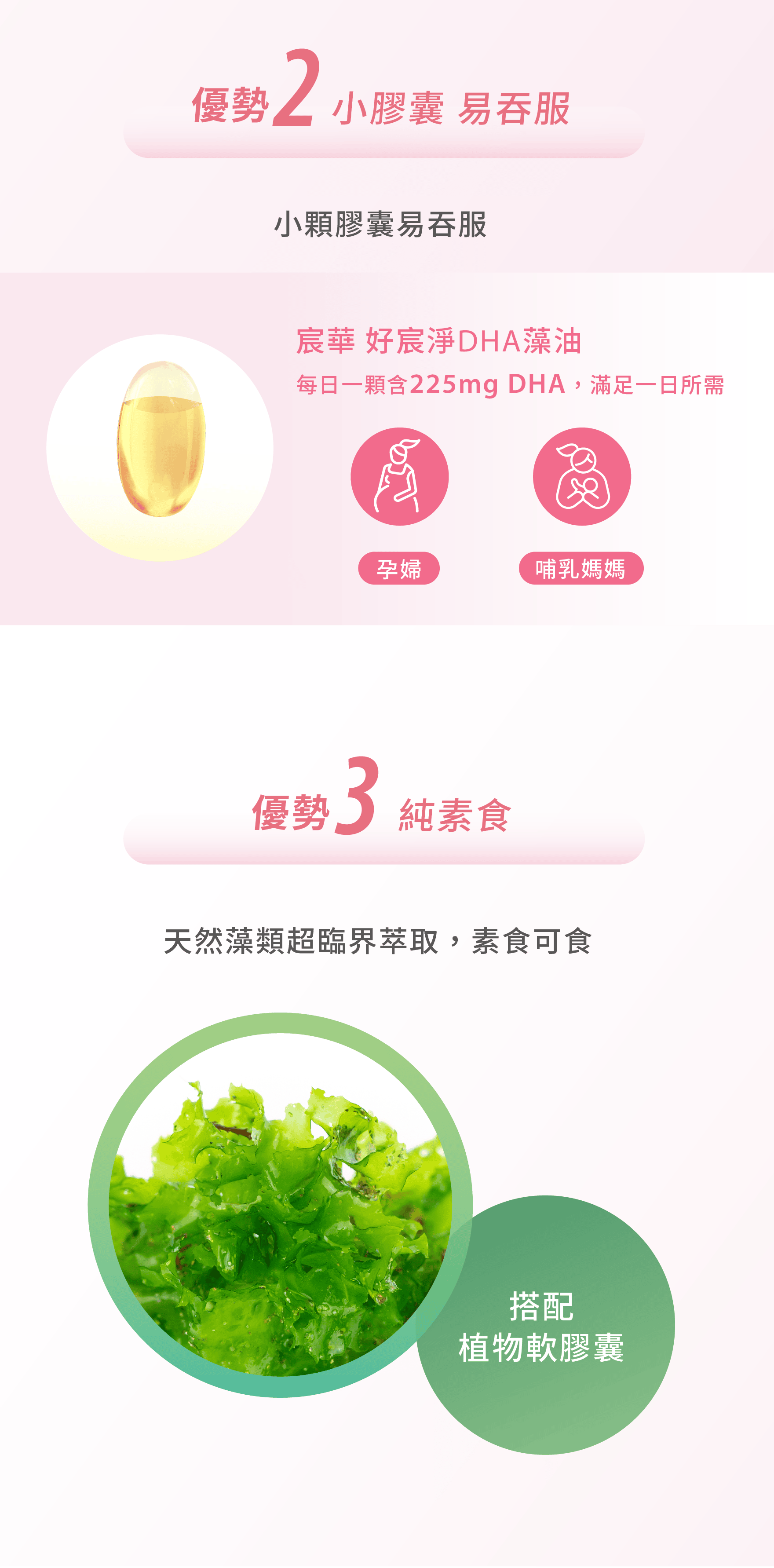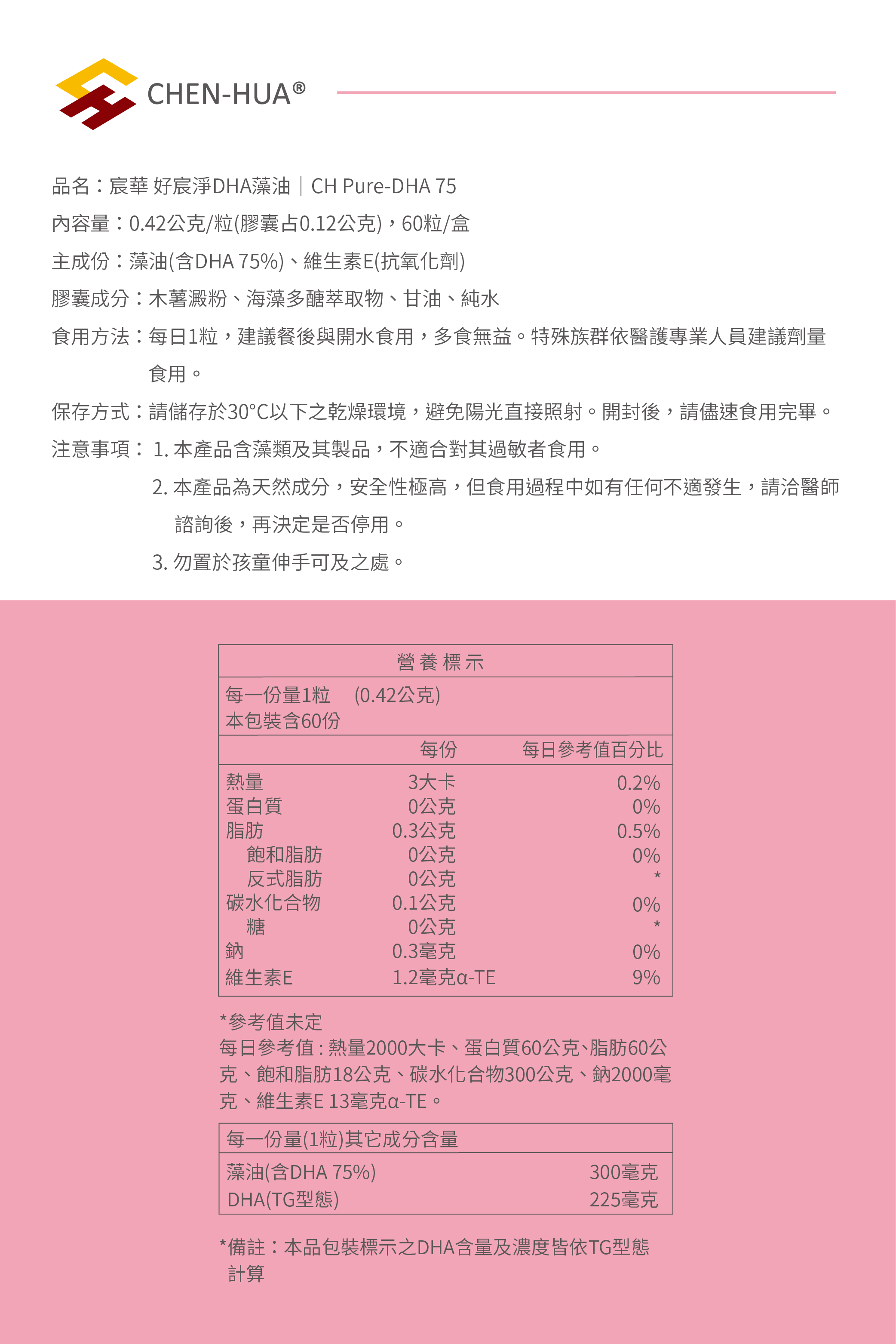 主成份:藻油0.42公克(膠囊占0.12公克,含DHA 75%)、維生素E(抗氧化劑)