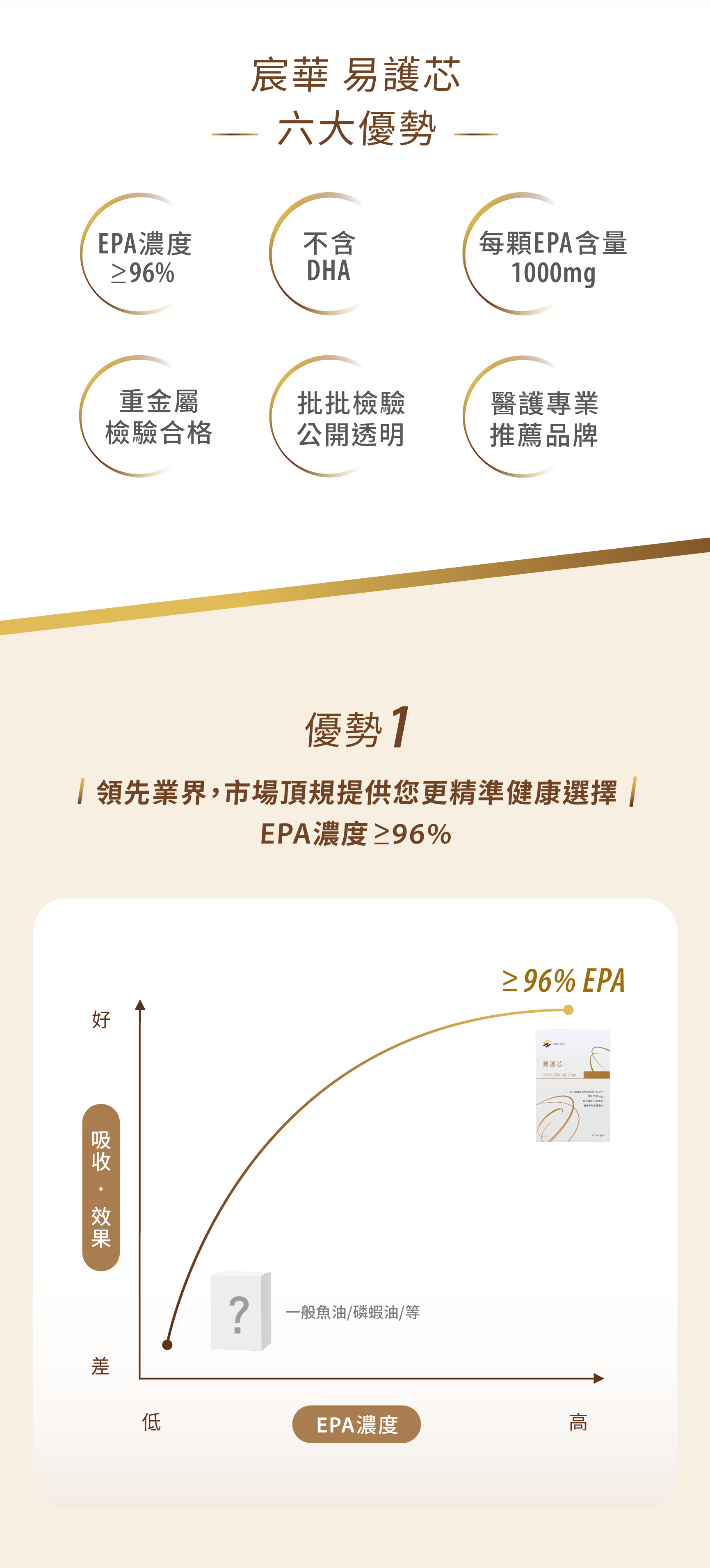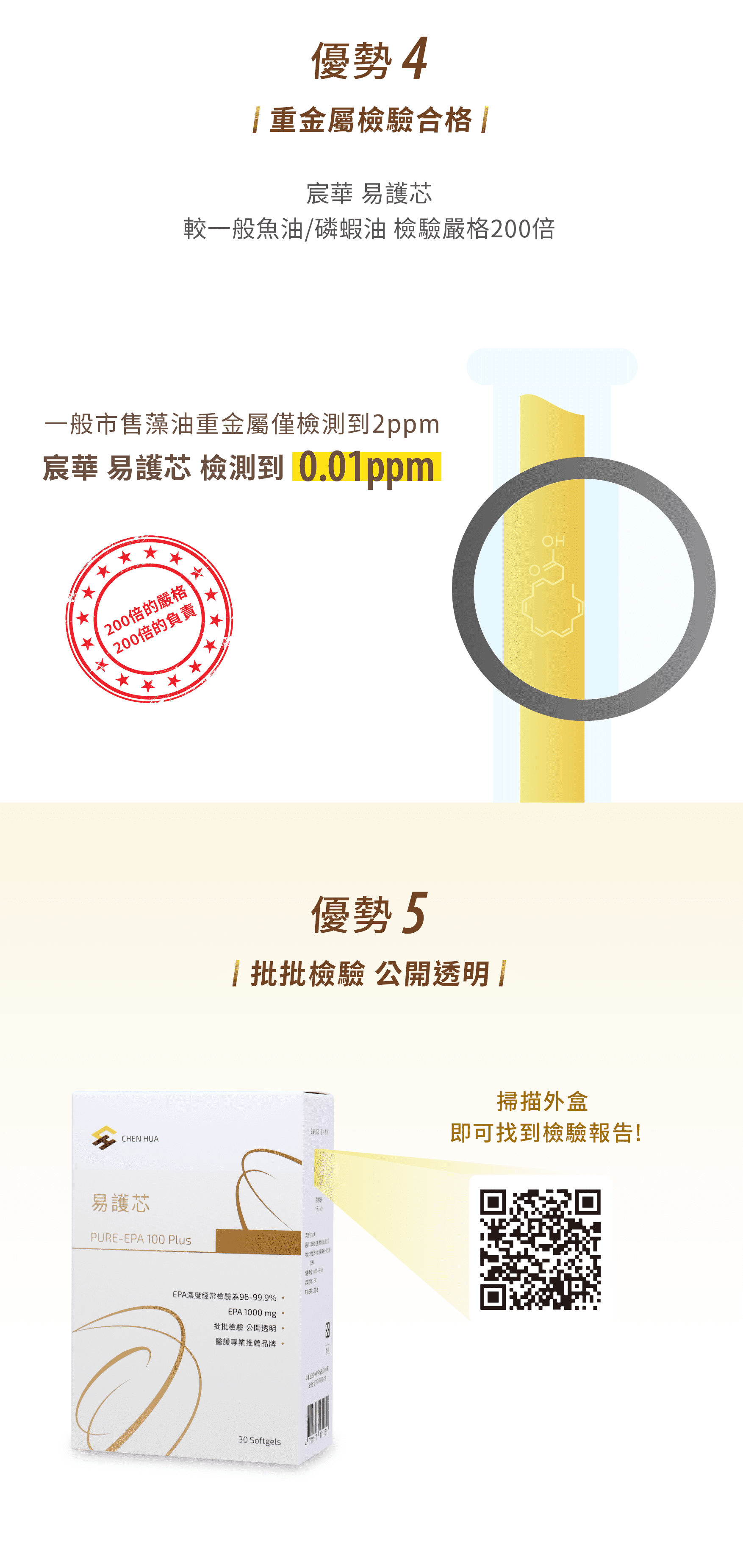 宸華易護芯是領先業界最高規格 EPA,每批皆經嚴格檢驗,保證重金屬/塑化劑符合國際與台灣標準,檢驗報告公開透明(外包裝有檢驗報告連結)提供您更精準健康選擇!