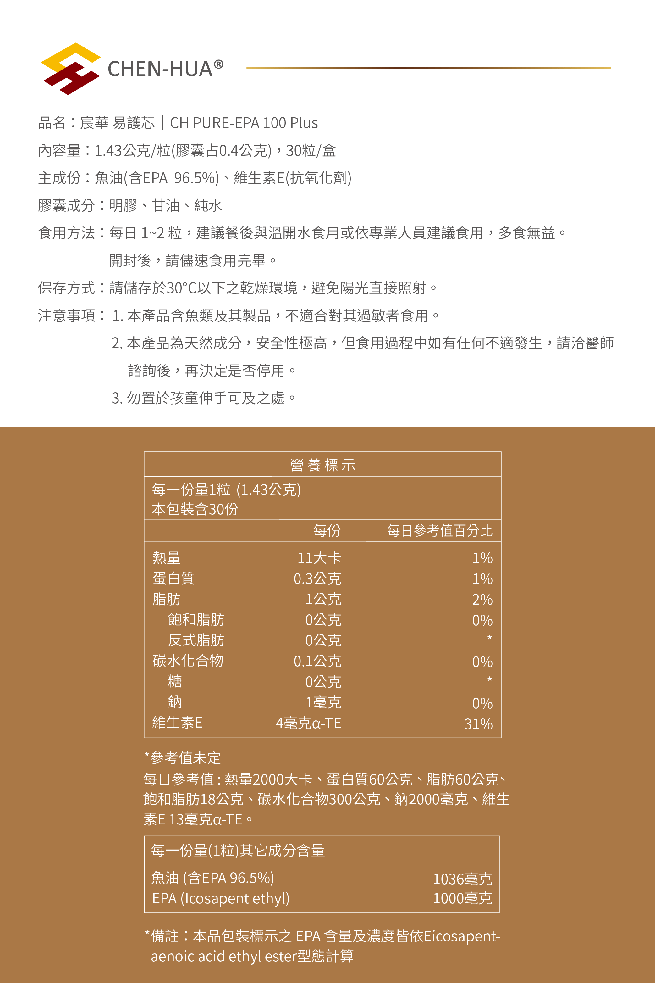 主成份:魚油(含EPA 96%,膠囊佔0.4公克)、維生素E(抗氧化劑)