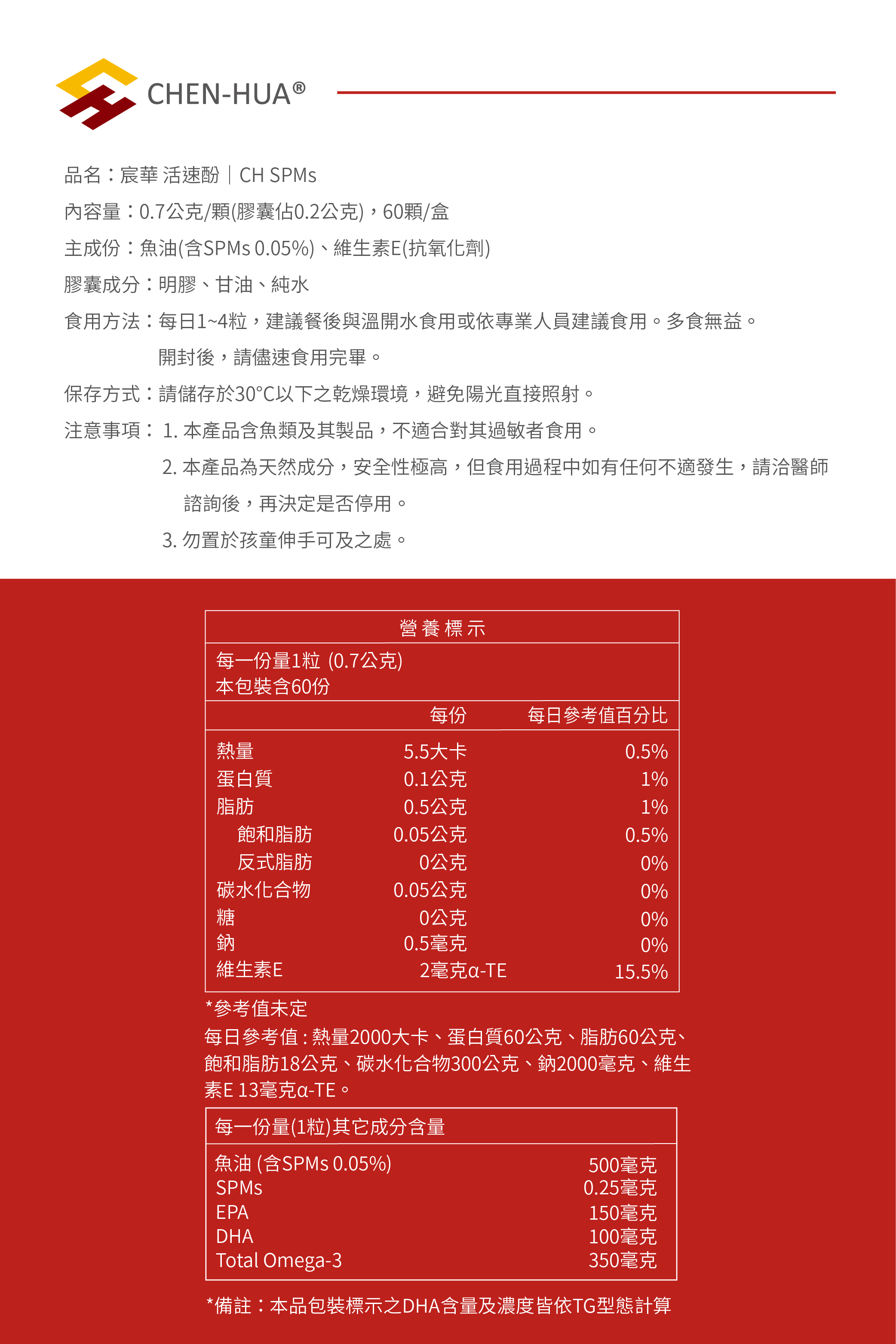 主成份:魚油(含SPMs 0.05%)、維生素E(抗氧化劑)
